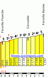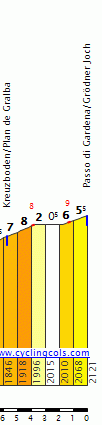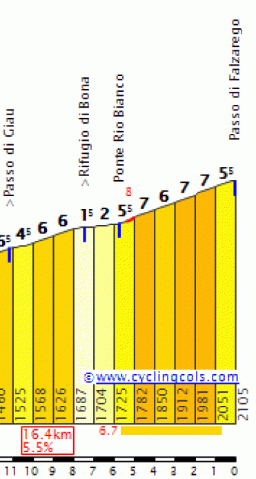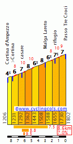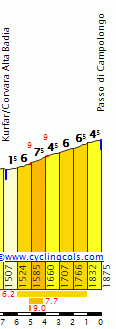 Option 2: From the Passo di Giau descend towards Cortina, but soon join the road to the Passo Di Falzarego (2105m) which you climb from the east. After a pause at the top, it is downhill back to the hotel. 64km with 1850m ascent