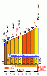 Option 2: After a short descent to a village called Don't, the gradients turn a bit tougher as we take on the Passo Duran (1602m) from the north, another Giro favourite. The descent requires your concentration, then all you have to do is climb gently uphill on a quiet side road. 70km with 1750m ascent
