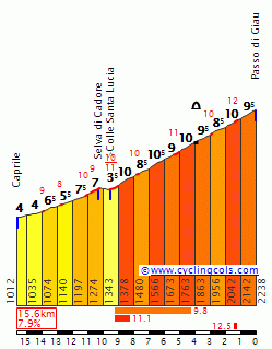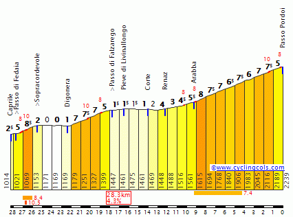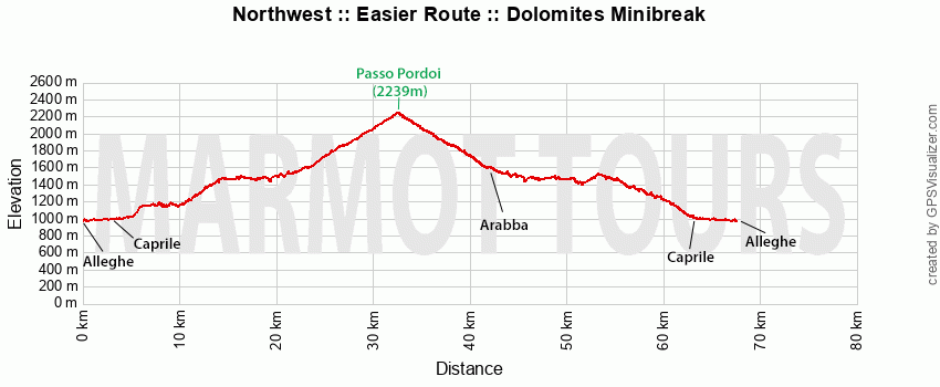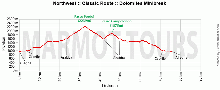 Option 2: Head back to the village of Arabba, then ride up the south side of the Passo di Campolongo (1875m). 76km with 1880m ascent