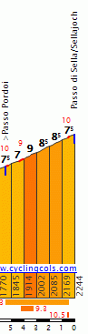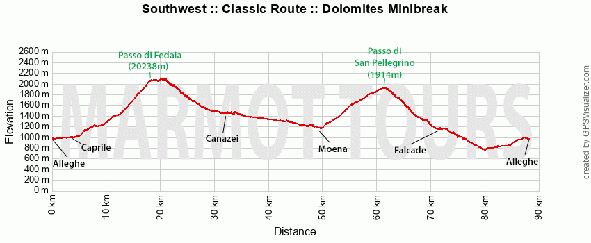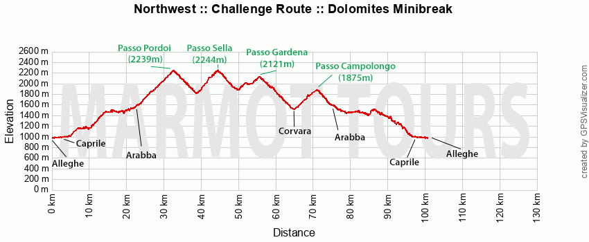 Option 3: Those who have heard of the Maratona dles Dolomites will be itching to complete the Sella Ronda route — one of Europe's great rides over four spectacular passes: Passo di Pordoi, Passo di Sella (2244m) from the south, Passo di Gardena (2121m) from the west, and the north side of the Passo di Campolongo (1875m). The altitude drop between the passes is not huge, but it is nonetheless a big day out! 101km with 2500m ascent