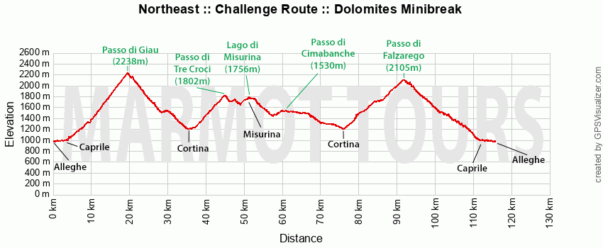 Option 3: Descend from the Passo di Giau to Cortina d'Ampezzo, a high-altitude, attractive Italian town that hosted the 1956 Winter Olympics. Then climb the Passo Tre Croci (1805m) which has a few 'testing' little sections before briefly descending to the well-known and very beautiful Lago di Misurina. After a pause for lunch, take on the Passo de Cimabanche (1530m) from the east back around to Cortina, from where the eastern gradients of the Passo Di Falzarego (2105m) still stand between you and the hotel. 116km with 3030m ascent