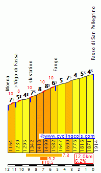 Option 2: Once over the other side, there's no turning back! You drop down into civilisation and the lush green valley floor of the Val di Fassa. This makes for some easy cycling on good tarmac before you turn east to take on the Passo di San Pellegrino (1914m) from the west. This is a lovely climb up into the pine forest and is often used by the Giro d'Italia. Once over the top you roll down into the Alleghe Valley and climb gently back up the valley floor to the hotel. 88km with 2151m ascent