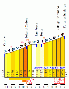 After a brief lakeside warm up to Caprile, you take on the eastern slopes of the Passo Pordoi (2239m), which provides a perfect introduction to the Dolomites. It is a long climb (28.5km), but in general, the gradients are kind and there are even a few short downhill sections! The views from the top are magnificent and there is a great choice of cafes and restaurants at the top. From here all the route options are fantastic!